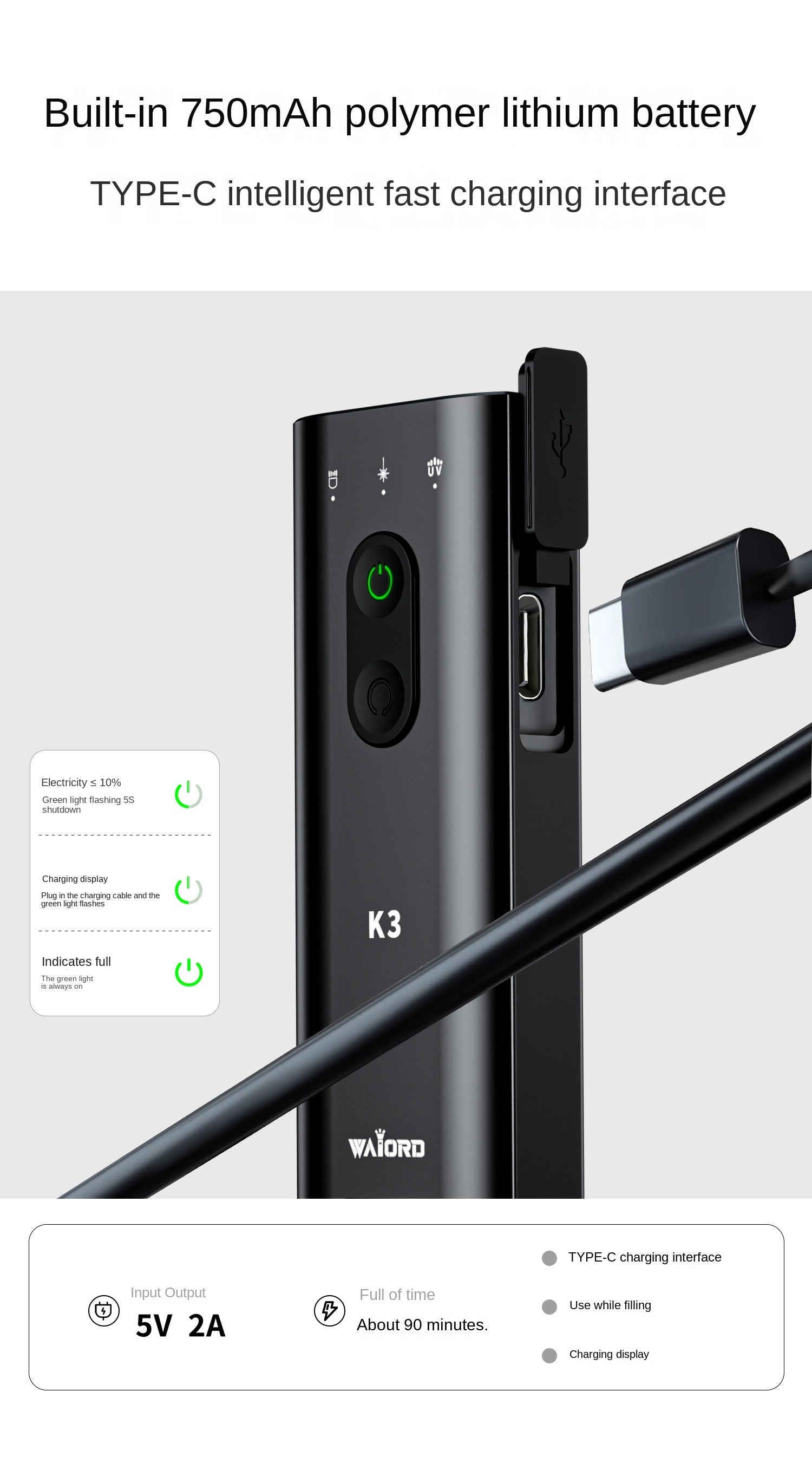 Powered by a 750mAh Type-C rechargeable battery, the K3 charges fully in about 90 minutes.